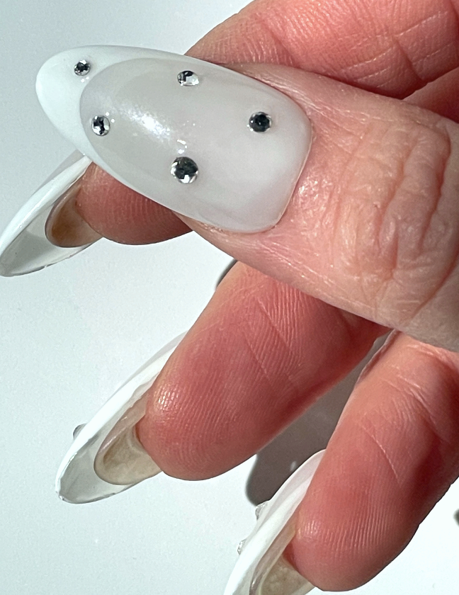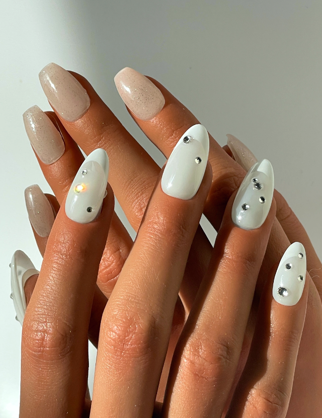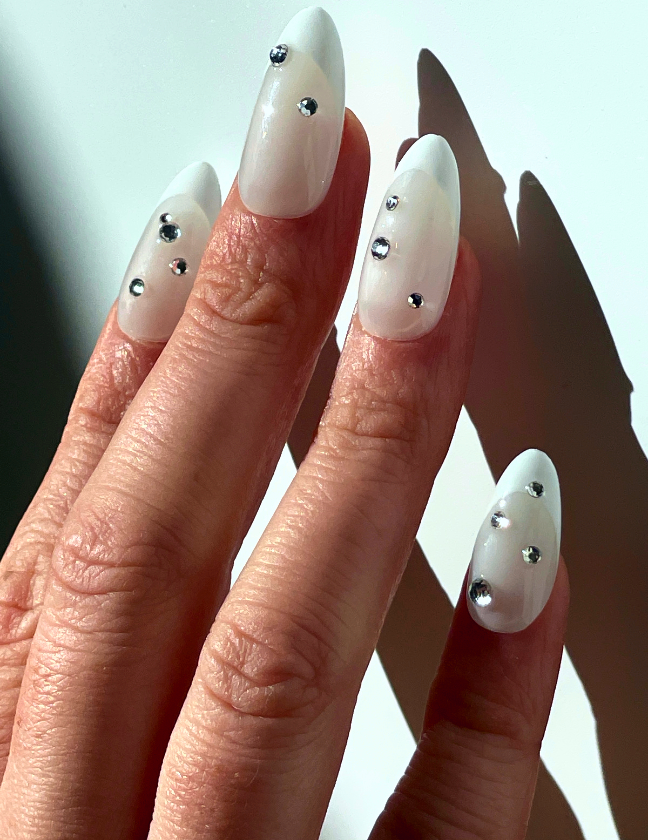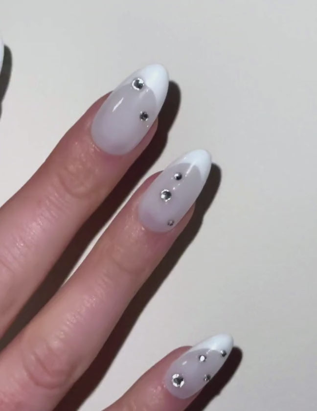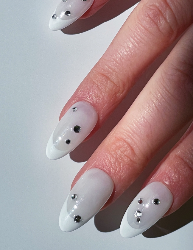 1. A chic milky white modern french with a slightly deep smile line in crips bluey white to make it pop, adorned with tiny clear crystals for the perfect amount of sparkle.