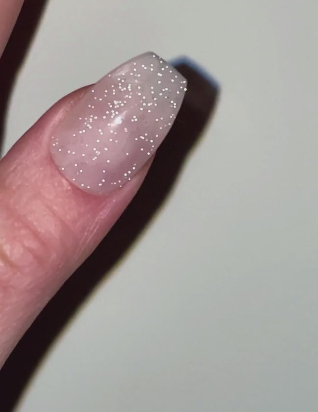 2. A chic vanilla nude set painted with a subtle coat of reflective sparkle. Nails will have a subtle glitter under natural light and a reflective diamond-like shine under a flashlight.
